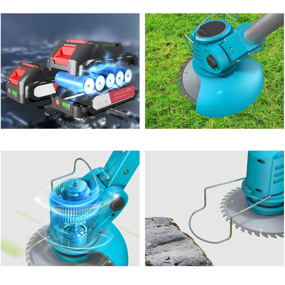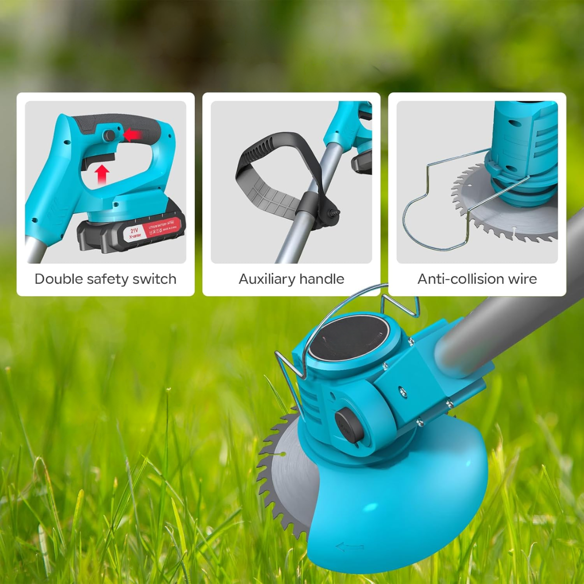 This cordless grass trimmer features a powerful motor with up to 18000 RPM speed, delivering efficient cutting performance. It easily trims grass, weeds and small plants for a clean and neat garden. - Three Types of Cutting Blades